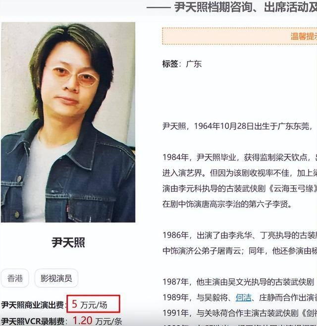 别看尹天照在影视圈中不经常活跃,但是他的一举一动仍备受关注,近年他因在内地酒吧频频登台,而被网民称为酒吧专业户,还曾有网民透露,尹天照曾在广东一带登台演出,他每次登台的佣金是5万人民币,在港星中属于价格比较低,与其他港星的报价相差甚远。