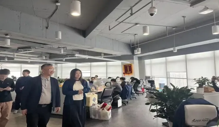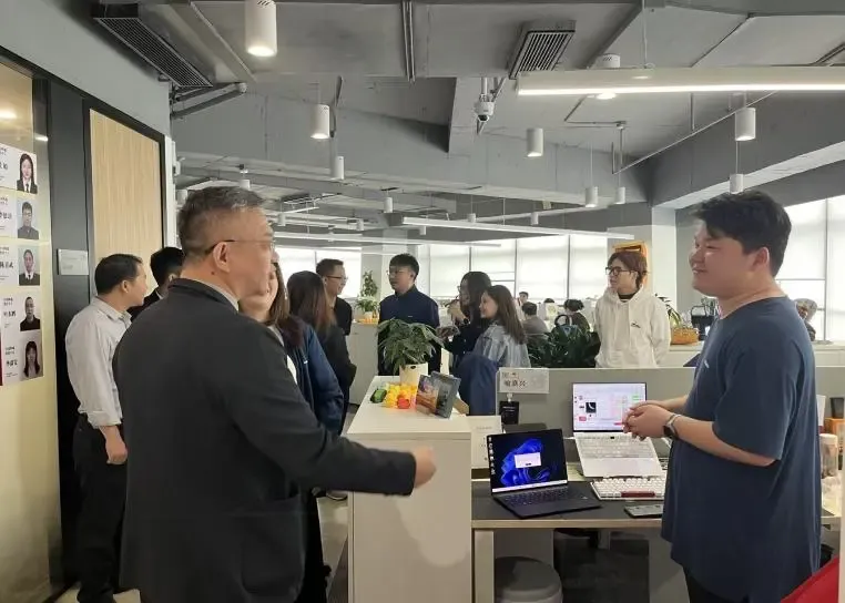 在交流会开始前,华为慧通团队引导东莞城市学院参会老师团队参观企业办公开放区域。参观过程中,东莞城市学院副校长康贤刚与在岗的城院毕业生亲切互动,询问其工作适应、技能提升与成长收获,学生积极分享工作心得并感谢母校培养。
